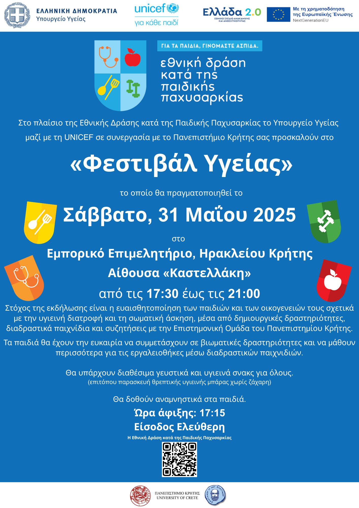 Στο πλαίσιο της Εθνικής Δράσης κατά της Παιδικής Παχυσαρκίας, τo Σάββατο 31/05/2025 και ώρα 17:30 – 21:00 θα διεξαχθεί το «Φεστιβάλ Υγείας» στο Εμπορικό Επιμελητήριο Ηρακλείου, Αίθουσα «Καστελλάκη», με ελεύθερη είσοδο στο κοινό.